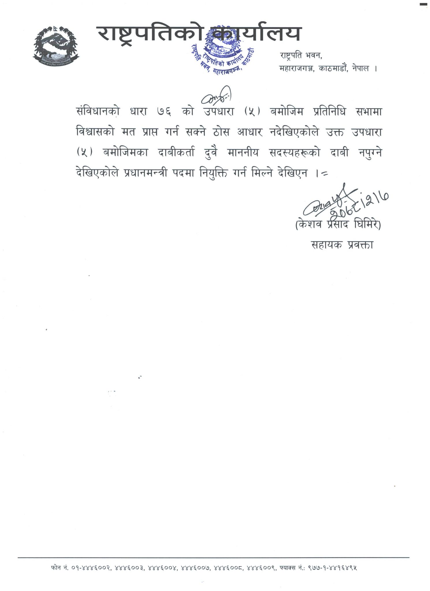 राष्ट्रपति र प्रधानमन्त्रीको आलोचना भइरहेको थियो । एकातिर कांग्रेस,माओवादी,एमालेको माधव नेपाल समुह र जसपाको उपेन्द्र यादव समुहले राष्ट्रपतिको उक्त आह्वान गैरसंवैधानिक भन्दै राष्ट्रपतिमाथि महाअभियोग लगाउनुपर्ने बताइरहेका थिए । अर्कोतिर राष्ट्रपतिले भने अनुसारको धारा ७६ को उपधारा ५ बमोजिम सरकार गठन गर्न एकआपसमा वार्ता र त्यसपछि हस्ताक्षर जुटाउन आज दिनभरी उनीहरु सक्रिय पनि भए ।