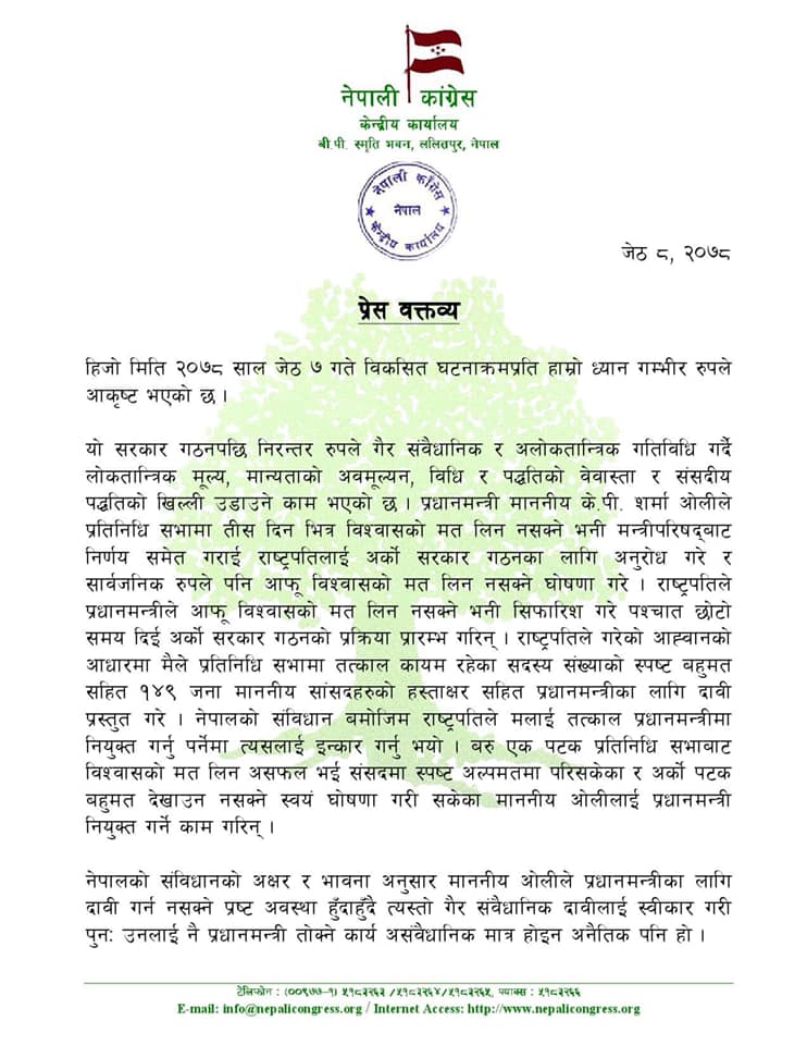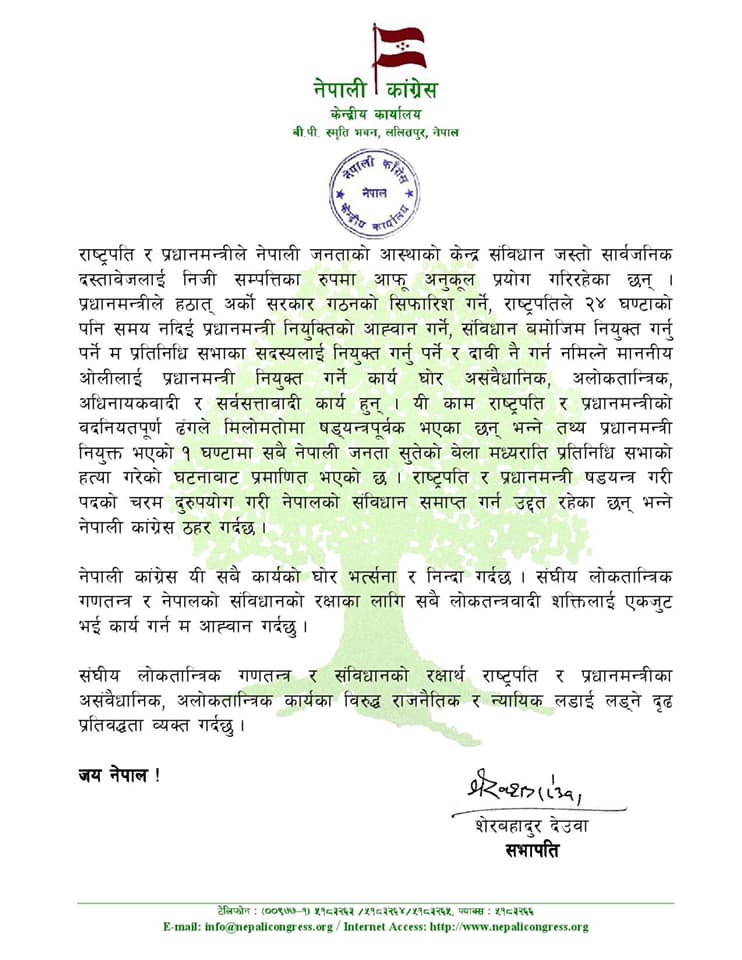 सभापति देउवाले भने- ‘राष्ट्रपति र प्रधानमन्त्रीले नेपाली जनताको आस्थाको केन्द्र संविधान जस्तो सार्वजनिक दस्तावेजलाई निजी सम्पत्तिका रुपमा आफू अनुकूल प्रयोग गरिरहेका छन् । प्रधानमन्त्रीले हठात् अर्को सरकार गठनको सिफारिश गर्ने, राष्ट्रपतिले २४ घण्टाको पनि समय नदिई प्रधानमन्त्री नियुक्तिको आह्वान गर्ने, संविधान बमोजिम नियुक्त गर्नु पर्ने म प्रतिनिधि सभाका सदस्यलाई नियुक्त गर्नु पर्ने र दावी नै गर्न नमिल्ने माननीय ओलीलाई प्रधानमन्त्री नियुक्त गर्ने कार्य घोर असंवैधानिक, अलोकतान्त्रिक, अधिनायकवादी र सर्वसत्तावादी कार्य हुन् । यी काम राष्ट्रपति र प्रधानमन्त्रीको वदनियतपूर्ण ढंगले मिलोमतोमा षड्यन्त्रपूर्वक भएका छन् भन्ने तथ्य प्रधानमन्त्री नियुक्त भएको १ घण्टामा सबै नेपाली जनता सुतेको बेला मध्यराति प्रतिनिधि सभाको हत्या गरेको घटनाबाट प्रमाणित भएको छ ।’