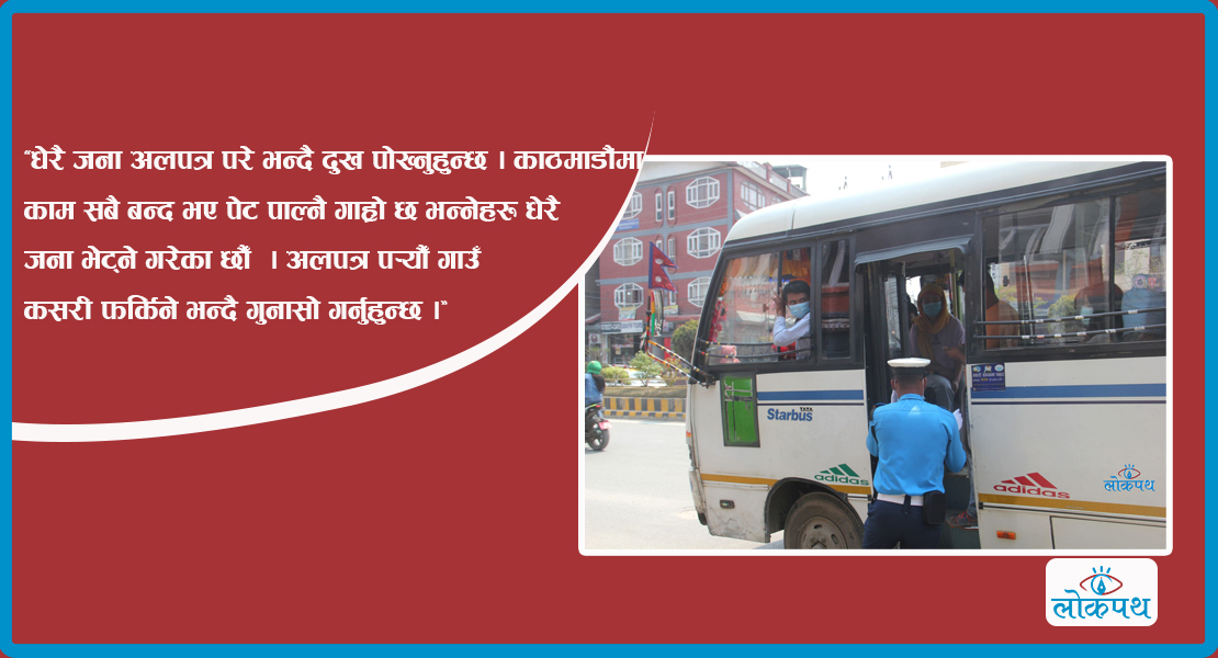 ‘धेरै जना अलपत्र परे भन्दै दुख पोख्नु हुन्छ । काठमाडौंमा काम सबै बन्द भए पेट पाल्नै गर्हो छ भन्नेहरु धेरै जना भेट्ने गरेका छौँ । अलपत्र पर्यौँ गाउँकसरी फर्किने भन्दै गुनासो गर्नुहुन्छ ।’ एसएसपी भट्टराईले बताए ।