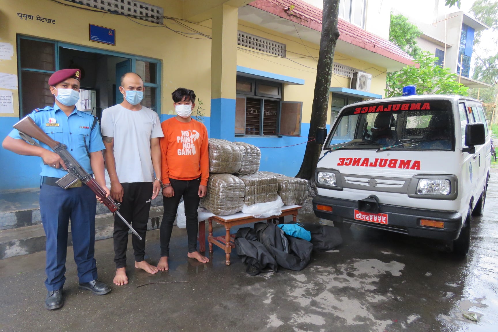 प्रहरीका अनुसार बरामद गरिएको गाँजा सहित एम्बुलेन्स, एम्बुलेन्स चालक धरान १५ का ३६ वर्षीय बल बहादुर लिम्बु र सोही एम्बुलेन्समा सवार धनकुटा घर भई हाल धरान ११ बस्ने २८ वर्षीय पोशन राईलाई पक्राउ गरिएको छ ।