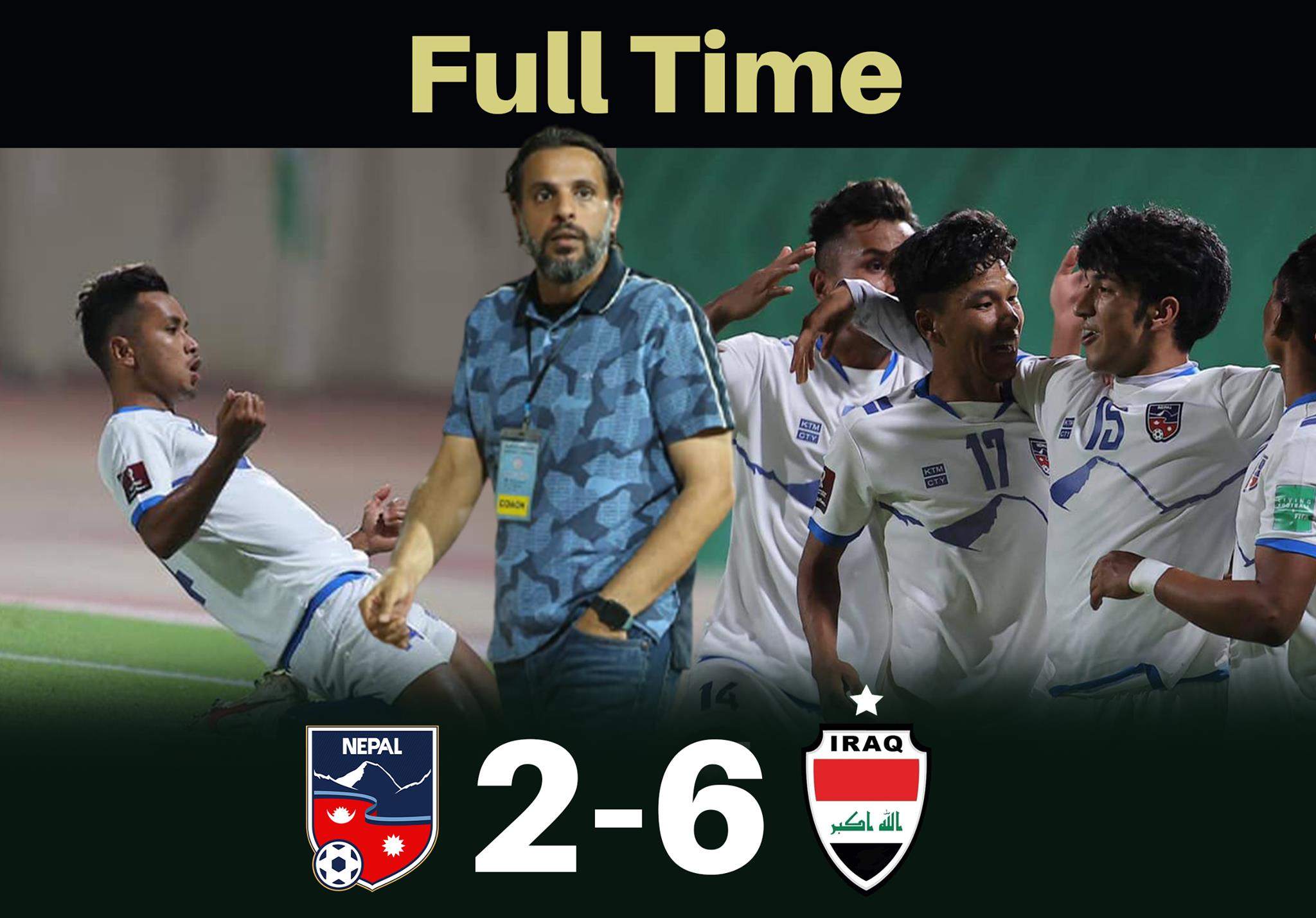 इराकको बासरा सहरमा खेलिएको खेलमा शुरुवाती १० मिनेटमा नै दुई गोल भएको थियो। ६औं मिनेटमा इराकका कप्तान अला अब्दुल जाहराले फ्रिकिकमार्फत गोल गरेका थिए। नेपालका कप्तान तथा गोलरक्षक किरण चेम्जोङले बल ‘जज’ गर्न नसक्दा गोल हुन पुगेको थियो।