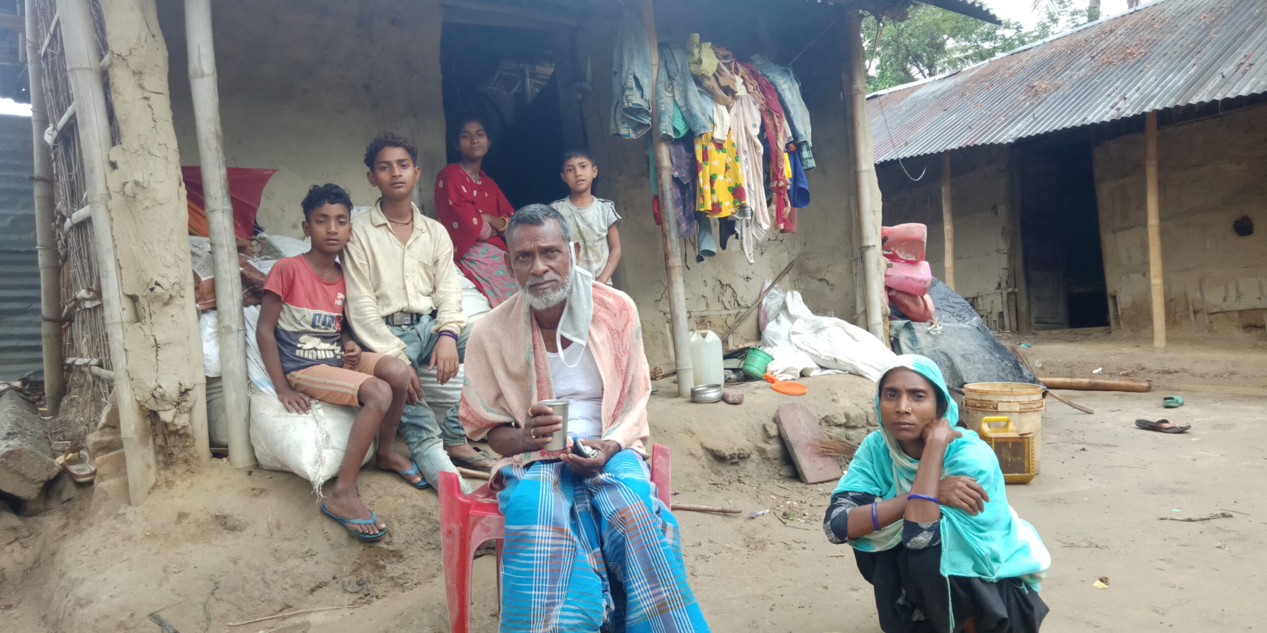 डेरा लिएको एक कोठे झुप्रो घरमा चार बालबालिकासहित बुवा र छोरी बस्छन् । कोठा अगाडि ठूला–ठूला बोरोका थैलो राखिएका छन् । त्यसैमाथि निन्याउरो अनुहार लगाएर चारै जना नाती नातिनीहरू बसेका छन् ।