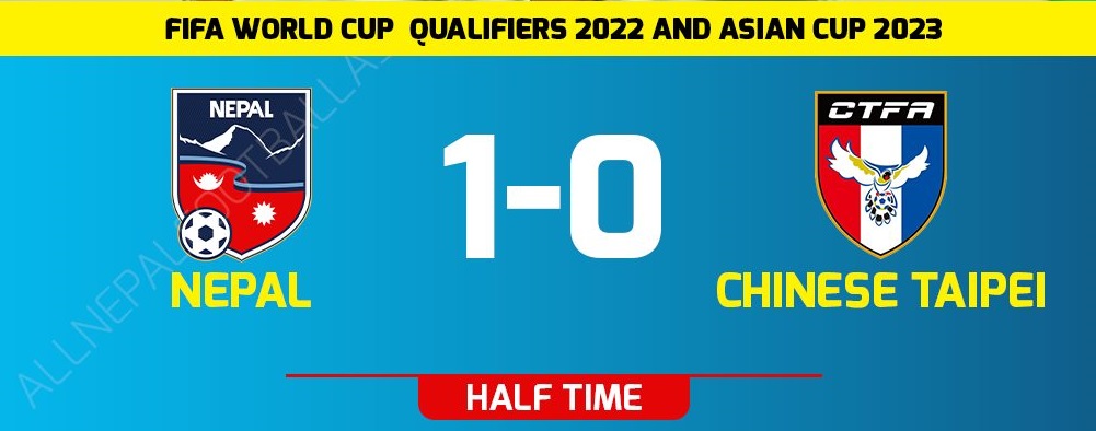 काठमाडौं।  चाइनिज ताइपेइविरुद्धको खेलमा नेपालले पहिलो हाफ आफ्नो पक्षमा पार्न सफल भएको छ। खेलको तेस्रो मिनेटमै अन्जन विष्टको पेनाल्टी गोलमार्फत नेपालले अग्रता लिन सफल भएको थियो।