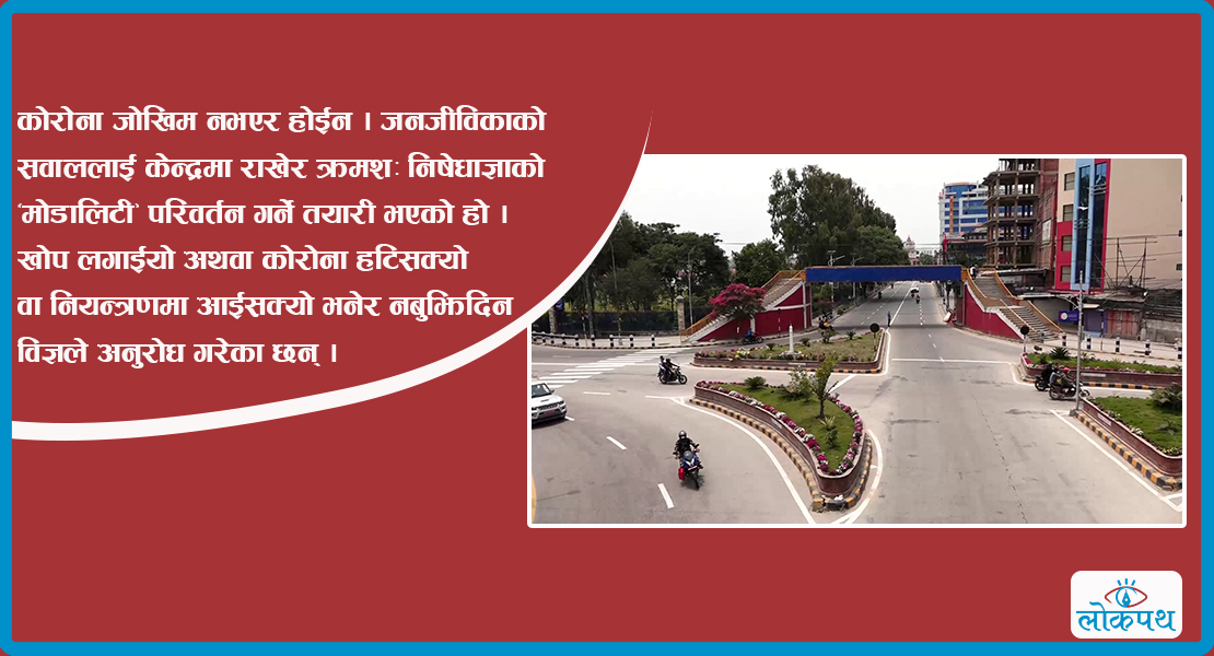 यसैबीच कोरोना संक्रमण र मृत्युदरमा उल्लेख्य कमी नआएतापनि सरकारले जनजीविकासँग जोडिएका सवालहरुलाई मध्येनजर गर्दै निषेधाज्ञाको ‘मोडालिटी’ परिवर्तन गर्दै ‘लुजडाउन’ को नीति अपनाउने तयारी गरेको छ।