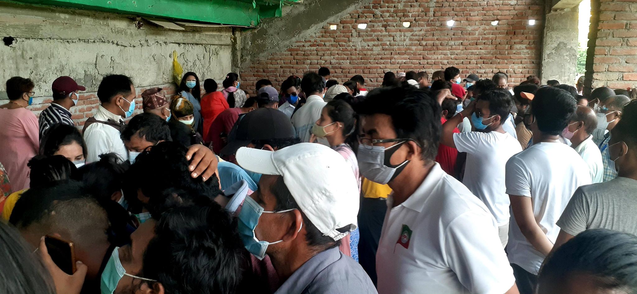 खोपको कार्डमा नाम लेख्ने स्वास्थ्यकर्मीलाई सर्वसाधारणले वरिपरिबाट घेराबन्दी गर्ने गरेका छन् । बजारमा भीडभाड बढ्यो भन्दै निषेधाज्ञा गरिरहेका बेला खोप केन्द्रमा पनि स्वास्थ्य मापदण्डको पालना भने देखिएको छैन ।