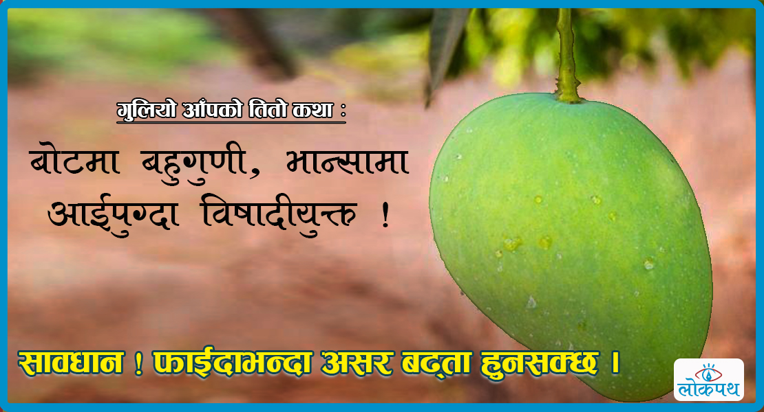 काठमाडौं लगायत देशका प्रमुख शहरहरुमा सिरहा, सप्तरी, महोत्तरी, सर्लाही लगायत तराई क्षेत्रबाट आउने आँप स्वादिलो र मिठो हुन्छ । तर आँपलाई धेरै दिनसम्म भण्डारण गर्न नसकिने हुनाले कतिपय व्यापारीले काँचो आँप टिपेर बजारमा ल्याई भण्डारण गरी कृत्रिम तरीकाले पकाएका हुन्छन् । यसो गर्दा आँपको स्वादमा मात्र होइन पोषक तत्वमा समेत प्रभाव पर्छ । त्यसैले आँपको सिजनमा तपाईले आँप किन्नुअगाडी त्यो प्राकृतिक रुपमा नै पाकेको हो वा अन्य विषादीको प्रयोग गरि पाकेको हो भन्ने कुरा निक्र्यौल गर्नुपर्छ ।