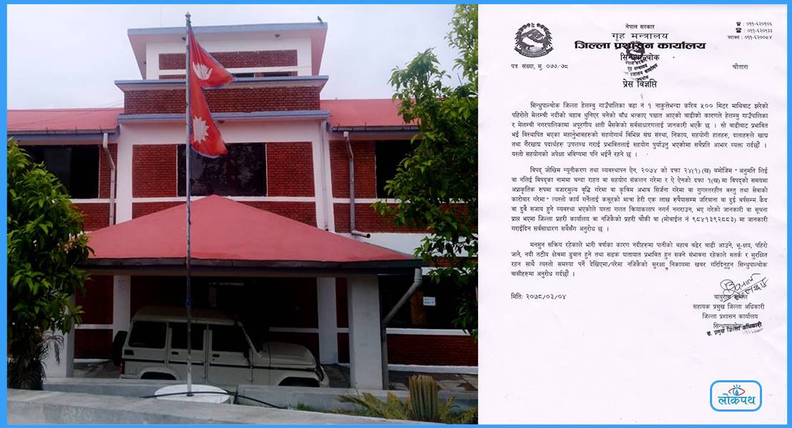 काठमाडौं । जिल्ला प्रशासन कार्यालय सिन्धुपाल्चोकले बाढी पीडितको नाममा जथाभावी चन्दा राहत वा सहयोग संकलन नगर्न निर्देशन दिएको छ ।