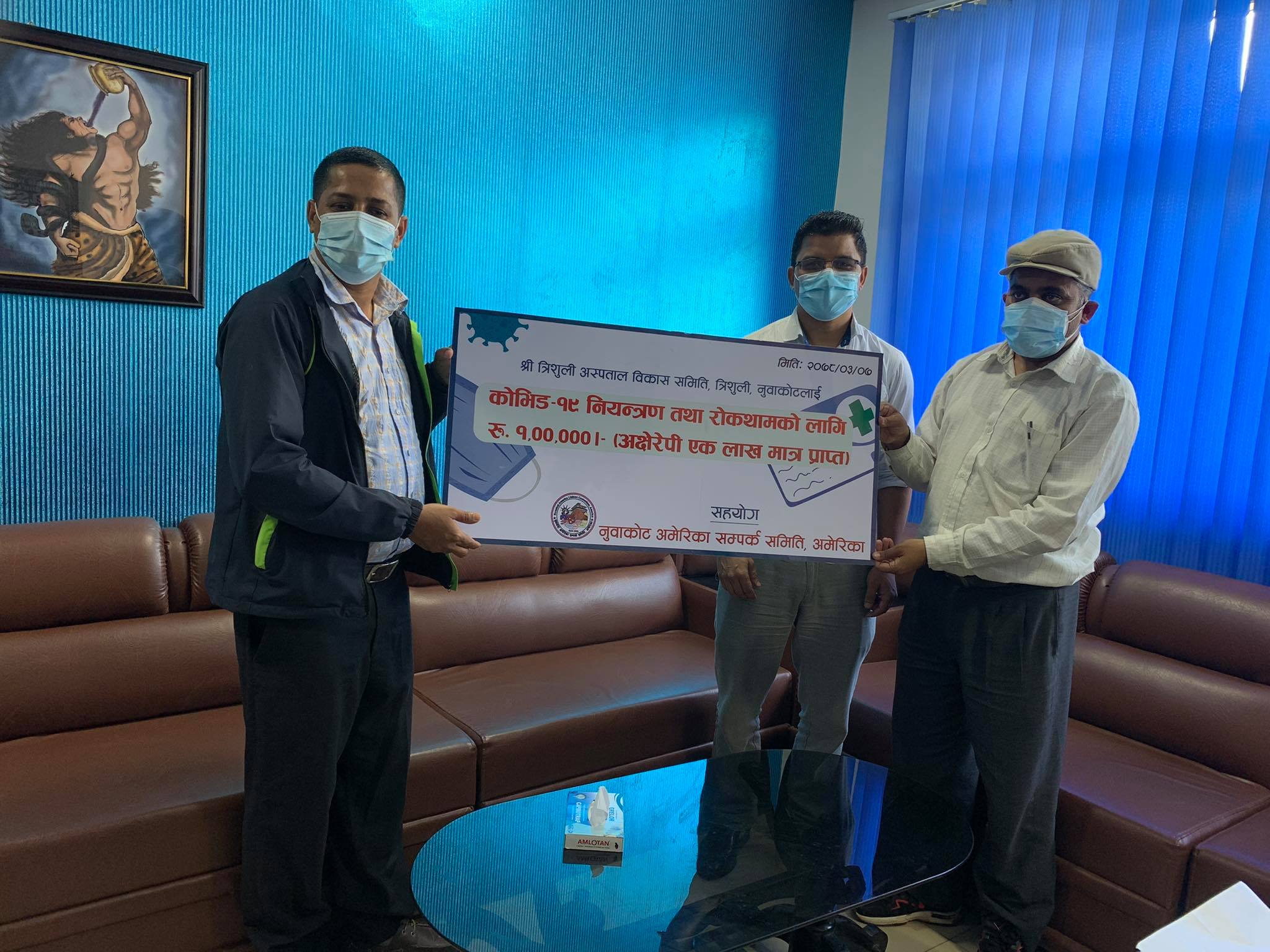 नुवाकोट लगायत विभिन्न जिल्लाबाट अमेरिकामा अध्ययन र रोजगारिको शिलशिलामा अमेरिकामा रहेका युवाहरुको सक्रियतामा संकलित रकमले स्वास्थ्य सामाग्री खरिद गर्न अस्पताललाई उक्त्त रकम उपलब्ध गराएको नुवाकोट अमेरिका सम्पर्क समिति अमेरिकाका सचिव शैलेश आचार्यले जानकारी दिए ।