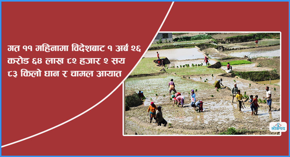 चालु आर्थिक वर्षको ११ महिनामा धान र चामल गरेर १ अर्ब २६ करोड ६४ लाख ८२ हजार २ सय ८३ किलो आयात भएको छ । यस अवधिमा धान-चामल किन्नका लागि मात्रै नेपालीले ४८ अर्ब १६ करोड २३ लाख ४९ हजार रुपैयाँ बराबर रकम विदेशमा पठाएका छन्।