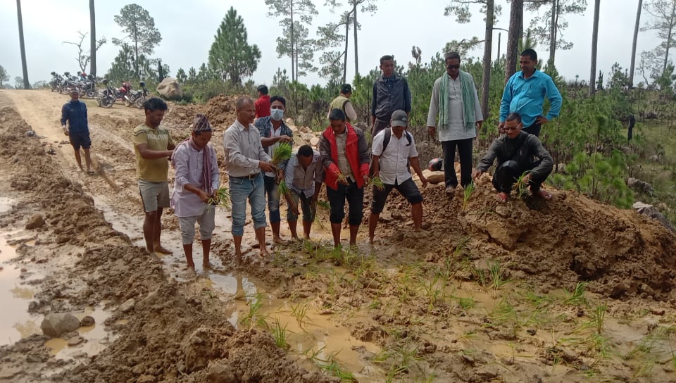 सडकको अवस्था देखेपछि धान दिवस (असार १५) को अवसरमा स्थानीयले सडकको काम समयमै हुनुपर्ने भन्दै सडकमै धान रोपाई गरे । उनीहरुले गाउँ पालिका जानुपर्दा भोग्नु परेको पिडालाई व्यक्त गर्न विरोध स्वरुप सडकमा धान रोपाई गरेका थिए ।