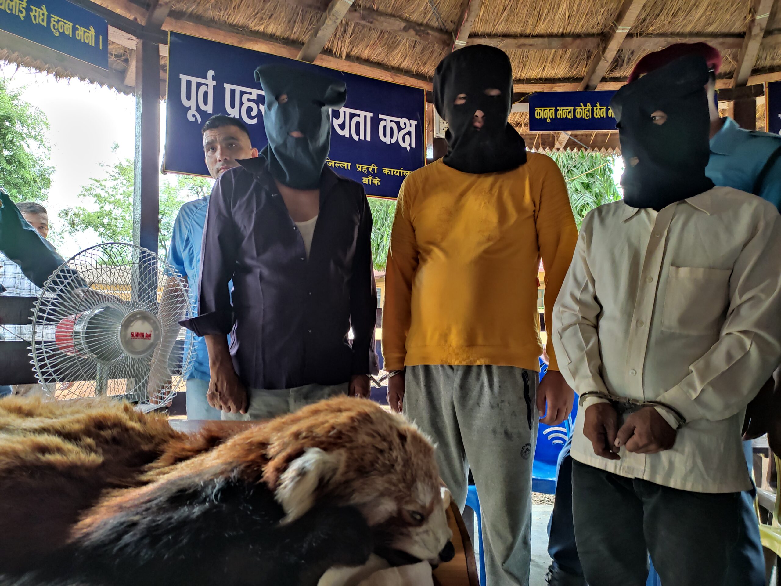 नेपालगंज उपमहानगरपालिका-१ पुष्पलाल चोकस्थित राप्ती गेष्ट हाउसको कोठा नम्बर १० बाट संरक्षित रेडपाण्डाको छाला १ थान र ४ वटा भालुको पित्त जस्तो देखिने वस्तुसहित ३ जनालाई शनिवार साँझ प्रहरीले पक्राउ गरेको हो ।