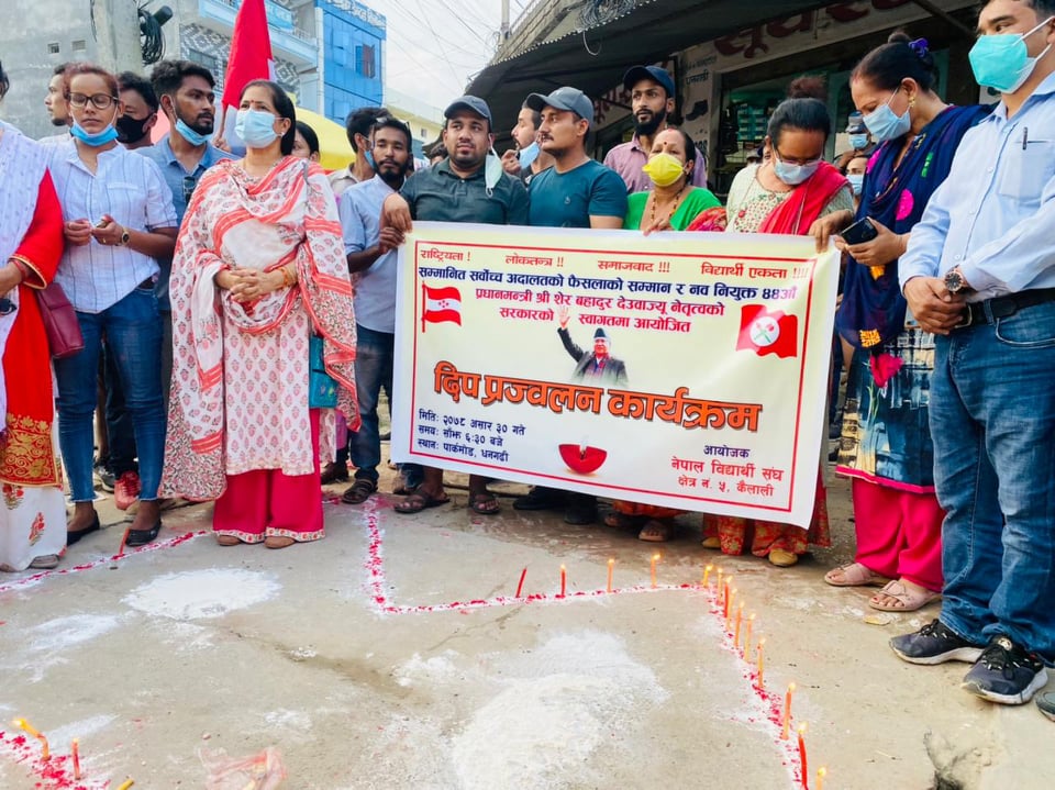 धनगढीस्थित पार्कमोडमा नेपालको नक्सामा दिप प्रज्वलन गरेर नेविसंघले नवनियुक्त प्रधानमन्त्री शेर बहादुर देउवा र सर्वोच्च अदालतको फैसलाको स्वागत गरेको हो । दिप प्रज्वलन गर्दै नेविसंघले नेपाली कांग्रेस जिन्दावाद, नेपालको संविधान जिन्दावाद, सर्बोच्च अदालत जिन्दावाद, शेरबहादुर देउवा जिन्दावाद जस्ता नारा लगाएका थिए ।