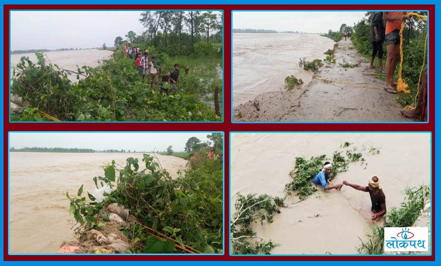 बाढीले मंगलबारदेखि तटबन्ध कटान गरिरहेको थियो । तटबन्ध जोगाउन स्थानीय र सुरक्षाकर्मी प्रयास गरे पनि आज बिहान तटबन्ध पुर्णरुपमा कटान गरिसकेको छ । तर बहाव घटेपछि पानी गाँउतिर पसेको छैन ।