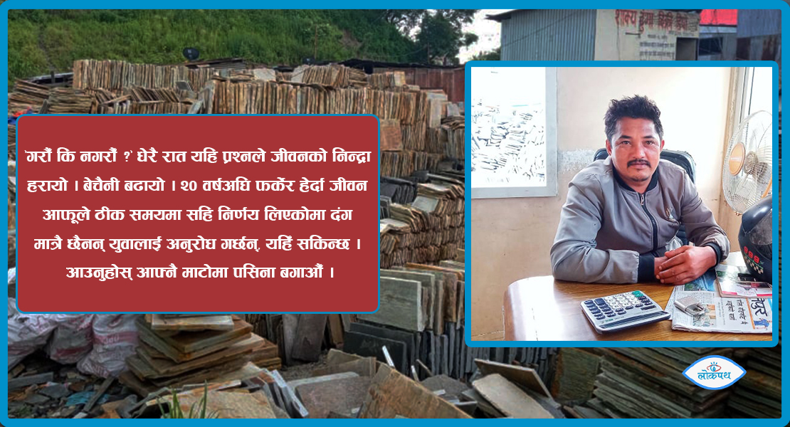 हुन्छ कि हुँदैन ? गरौँ कि नगरौँ ? जस्ता अनेक विचारहरुको द्वन्द्वमा चेपिएका उनले ‘गर या मर’को खतरामा बाँधिएर व्यवसाय सुरु गर्ने निधो गरे। नगरुन् पनि कसरी ? बुवा आमा, आफ्नो परिवार धान्नेदेखि घर व्यवहार चलाउने जिम्मेवारीले रन्थनिएको बेला उनको मनमा आएको उपाय थियो – ढुङ्गा व्यापार ।