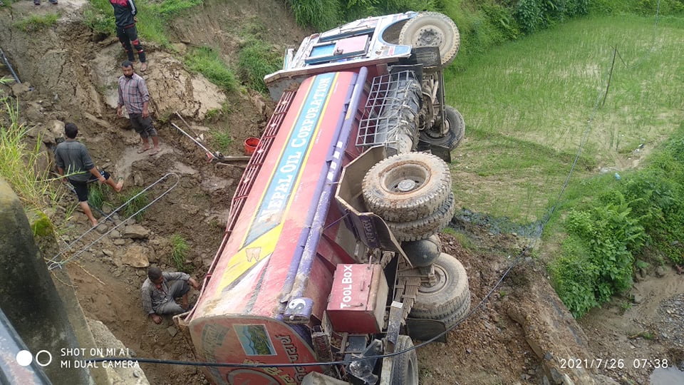 काठमाडौं । १२ हजार लिटर पेट्रोलियम पद्धार्थ बोकेरे अम्लेखगञ्जबाट सिस्नेरीका लागि छुटेको ट्याङ्कर दुर्घटना भएको छ ।