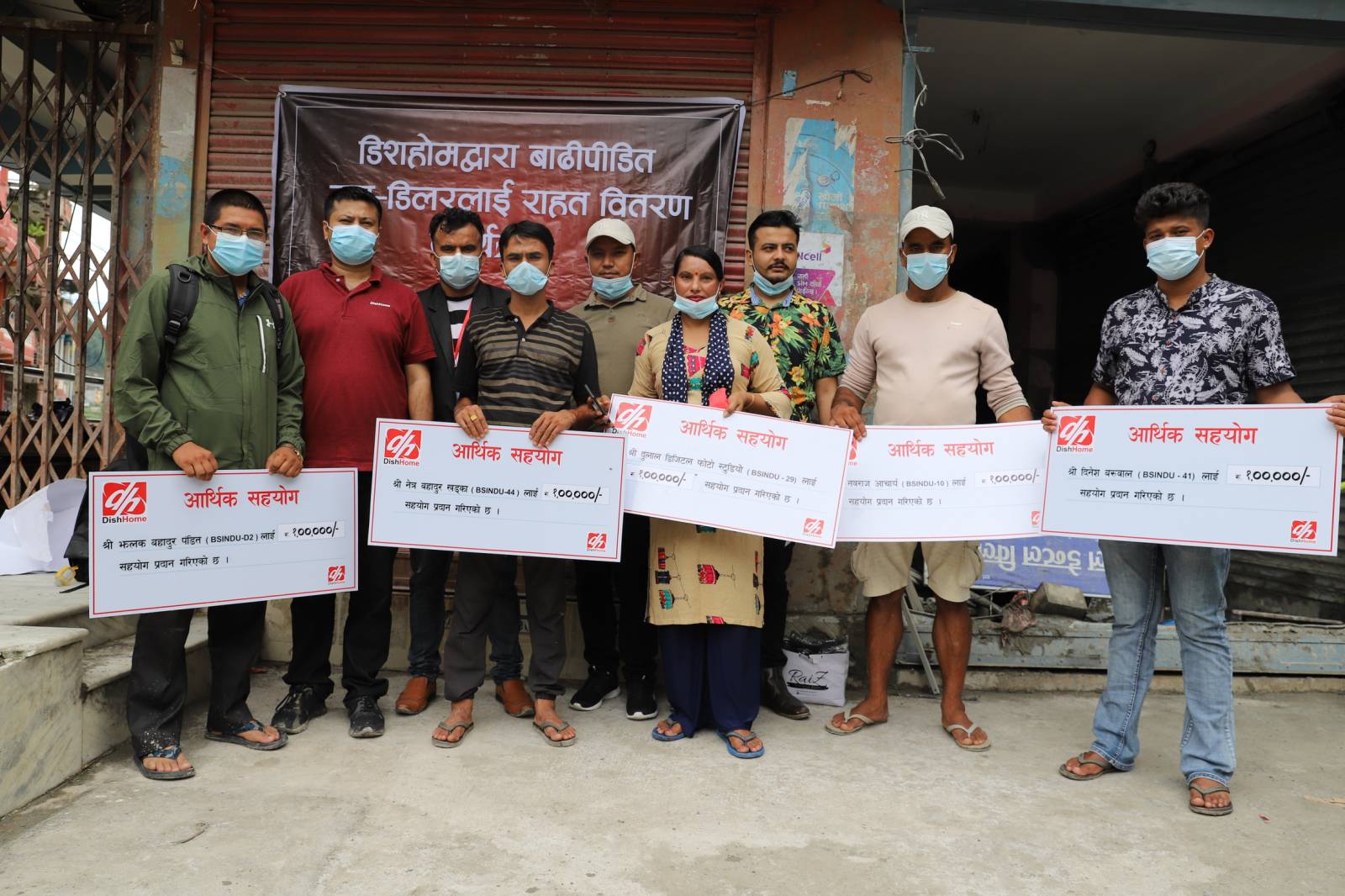 डिशहोमका रिजनल सेल्स म्यानेजर मनोज शर्मा र एरिया सेल्स म्यानेजर उज्वल न्यौपानेले राहत रकम हस्तान्तरण गरेका छन् ।