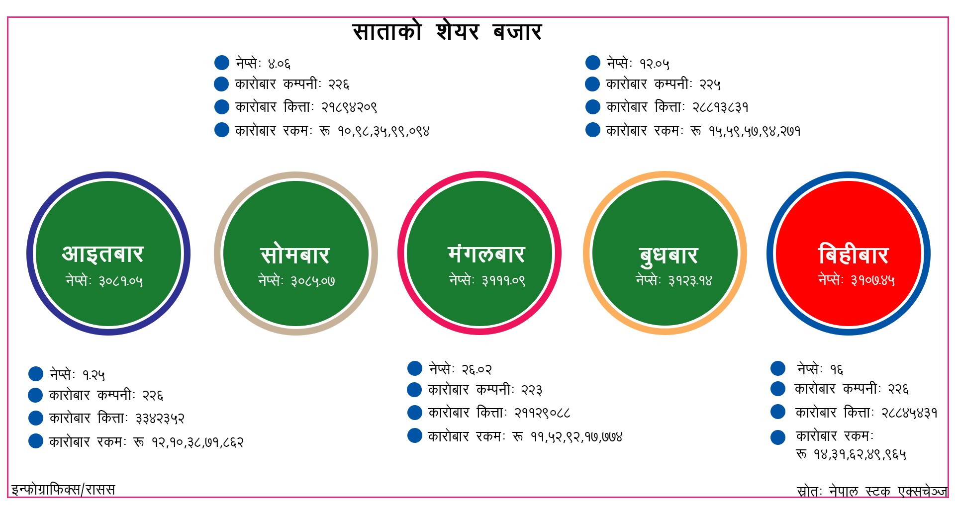 साउन लागेपछि लगातार उकालो लागेको नेप्सेले यस साता तीन हजार १०० बिन्दुको यात्रा गरिरहेको छ । नेपाल राष्ट्र बैंकले चालू आर्थिक वर्षको मौद्रिक नीति सार्वजनिक गर्ने तयारी गरिरहेको जनाएको छ । केन्द्रीय बैंकले केही दिन पहिले बैंक तथा लघुवित्त संस्थाको लाभांश वितरणमा कडाइ गरे पनि बजारमा त्यसको खासै प्रभाव परेको जस्तो देखिँदैन ।