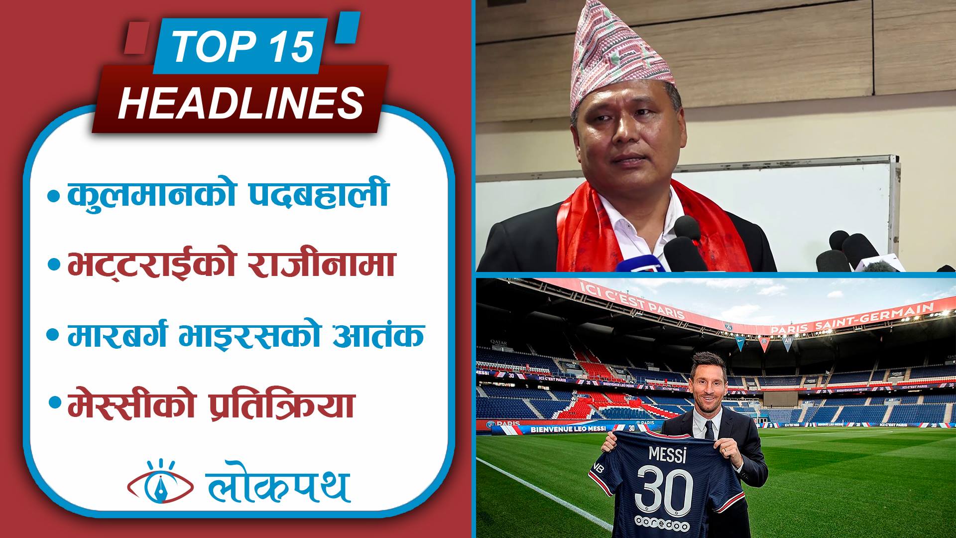 ४. लुम्बिनी प्रदेशका मुख्यमन्त्री शंकर पोखरेलले दिएको राजीनामा स्वीकृत, प्रदेशप्रमुख अमिक शेरचनद्वारा बहुमतको नयाँ सरकार गठनका लागि २२ घण्टाभित्र मुख्यमन्त्रीमा दाबी गर्न आह्वान ।