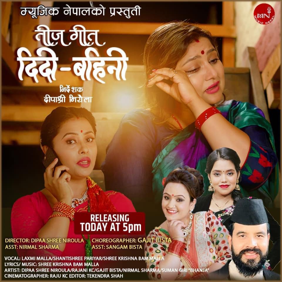 काठमाडौं । अभिनेत्री दीपाश्री निरौलाले छमछमी कम्मर मर्काएकाे तीज गीत ‘दिदी बहिनी’को म्युजिक भिडियो हालै सार्वजनिक गरिएको छ । शान्तिश्री परियार, लक्ष्मी मल्ल तथा  श्रीकृष्ण बम मल्लको स्वर रहेको गीतमा गायक मल्लकै शब्द तथा संगीत रहेको छ ।