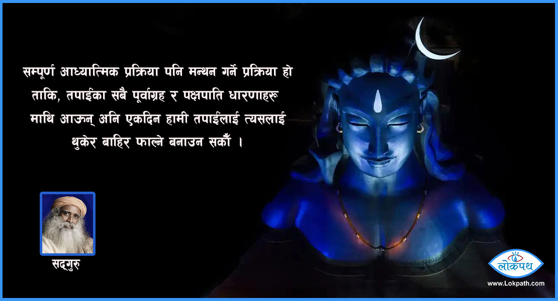 शिवको घाँटी निलो देखाइनुको प्रतीकात्मक अर्थ यही हो । उनले संसारको विष आफ्नो घाँटीमा जम्मा गरे, ताकि त्यसलाई जब निकाल्नुपर्ने हुन्छ, तब बाहिर थुक्न सकियोस् । यदि त्यो भित्र शरीरमा गएको भए, त्यसलाई कुनै पनि तरिकाले बाहिर निकाल्न सकिँदैनथ्यो । एक तरिकाले सम्पूर्ण आध्यात्मिक प्रक्रिया पनि मन्थन गर्ने प्रक्रिया हो— ताकि, तपाईंका सबै पूर्वाग्रह र पक्षपाति धारणाहरू माथि आऊन् अनि एकदिन हामी तपाईंलाई त्यसलाई थुकेर बाहिर फाल्ने बनाउन सकौँ ।
