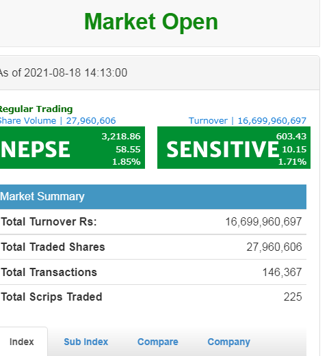 यो समाचार तयार पार्दासम्म (करिब २:१३ बजे) नेप्से सूचक ५८ अंकले बढेर ३२१८.८६ बिन्दुमा आइसकेको छ । करिब १६ अर्ब रुपैयाँको सेयर कारोबार भएको छ ।