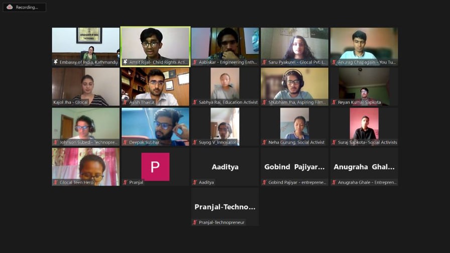 काठमाडौं । भारतीय राजदूतावास र एम/एस ग्लोबल प्राइभेट लिमिटेडले दूतावासका नियोग उप–प्रमुख नामग्य खम्पा र दूतावासको सहयोगमा सञ्चालित ‘ग्लोबल टीन हीरो’ कार्यक्रमका अन्तिम २० जना प्रतियोगीबीच भर्चुअल अन्तरक्रिया गरेको छ ।