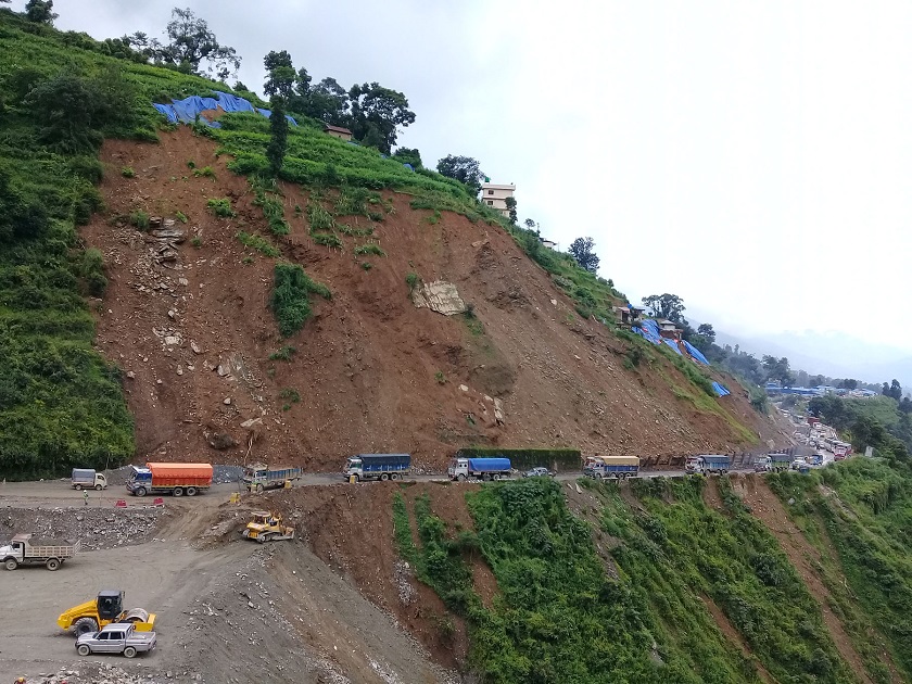 नजिकै दायाँ भागमा नागढुङ्गा सुरुङमार्गको मुख, त्यसको केही परको भित्तो अहिले नै खस्ला झैँ भएर बसेको छ । माथिबाट सर्किँदै सडकतिर आइरहेको छ । चिरा परेको पहाडको माथिल्लो भागबाट पानी पस्ला भनेर निला प्लाष्टिकले ठाउँठाउँमा टालिएको छ । तल्लो तहबाट फलामे बारमार्फत पहिरो रोक्ने असफल प्रयास भएको देखिन्छ ।