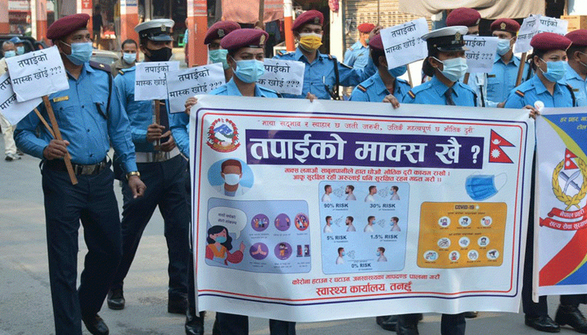 नयाँ भेरियन्ट सहितको कोभिड-१९ को संक्रमण बढ्दै गएको सन्दर्भमा यसबाट सिर्जना हुन सक्ने समस्या र चुनौतीलाई दृष्टिगत गरी संक्रमण रोक्न तोकिएको सुरक्षा मापदण्डलाई दुरुस्त रुपमा कार्यान्वयनका लागि नेपाल प्रहरीले ‘संक्रमणबाट आफू बचौँ र अरुलाई पनि बचाऔँ’ भन्ने नारा सहित ‘तपाईंको मास्क खोइ ?’ लगायतका विभिन्न सचेतनामूलक कार्यक्रमलाई अभियानकै रुपमा सञ्चालन गरिरहेको छ ।