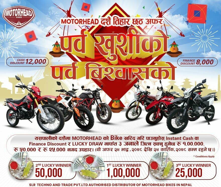 काठमाडौं । नेपालका लागि मोटरहेड मोटरसाइकलको आधिकारिक वितरक एसएलआर टेक्नो एन्ड ट्रेडले दशैँ, तिहार र छठलाई मध्यनजर गरी ‘पर्व खुसीको, पर्व विश्वासको’ अफर ल्याएको छ ।