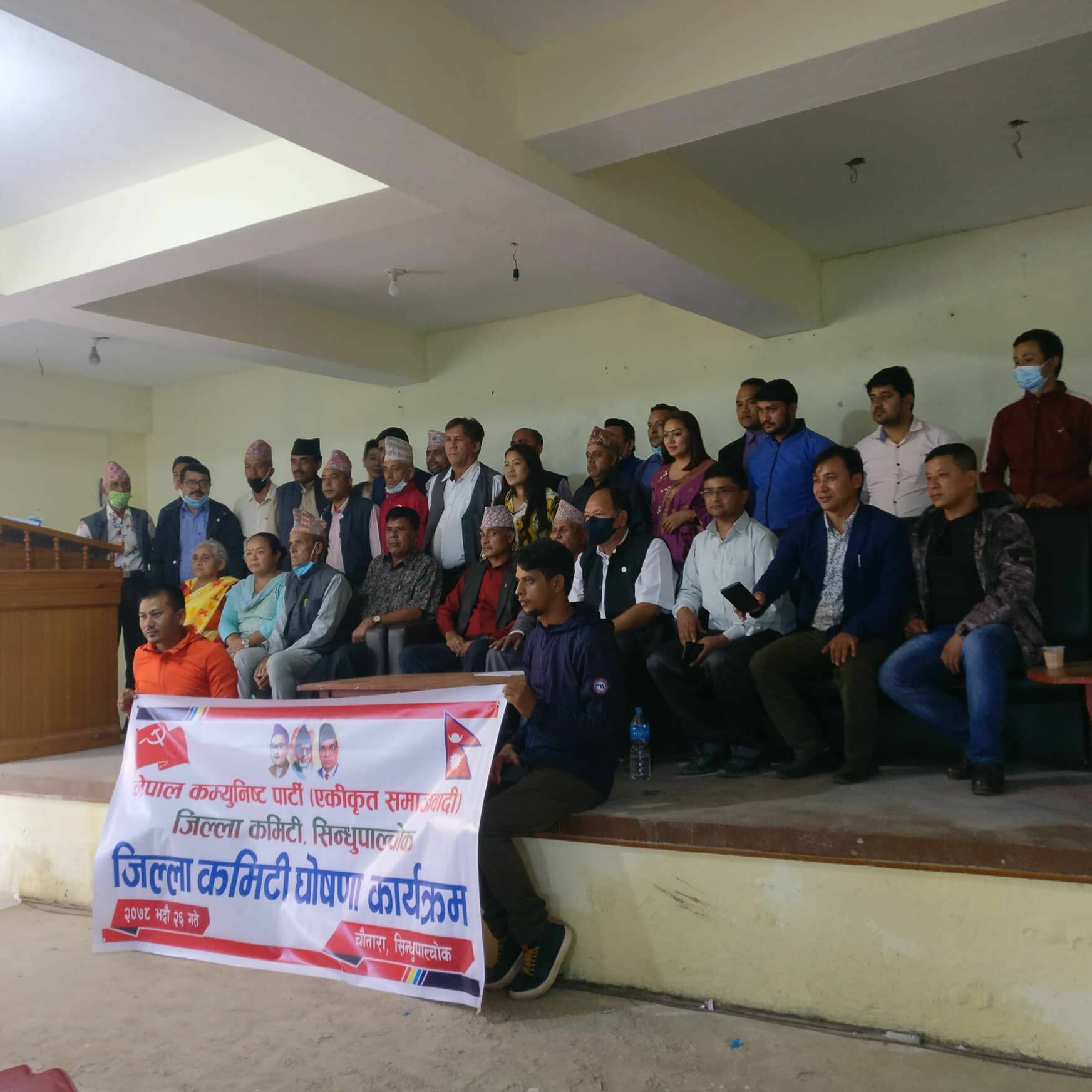 स्थायी कमिटी सदस्य बेदुराम भुसालको उपस्थितीमा सिन्धुपाल्चोकमा एकिकृत समाजवादीले जिल्ला कमिटी घोषण गरिएको हो । जिल्ला कमिटी सदस्यमा एमालेबाट वडा सदस्य जितेकाहरू रहे पनि उनीहरूले निर्वाचन कार्यलयमा सनाखत भने गरेका छैनन् ।