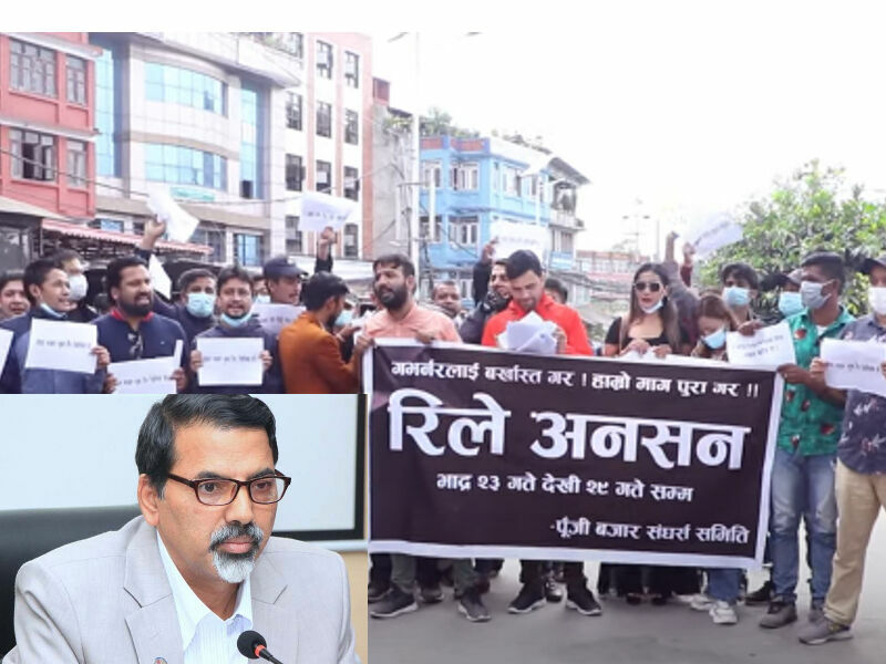 सेयर धितो कर्जाको सीमाका कारण रुष्ट बनेका उनीहरु विभिन्न तबरले प्रदर्शन गरिरहेका छन् नेपाल धितोपत्र बोर्ड, नेपाल स्टक एक्सचेन्ज र राष्ट्र बैंकलाई १८ बुँदे ज्ञापनपत्र बुझाएका छन् । उनीहरुले राष्ट्र बैंकमा घेराउ पनि गरेका छन् । उनीहरुले भदौ २३ गतेदेखि रिले अनशन बसिरहेका छन्।