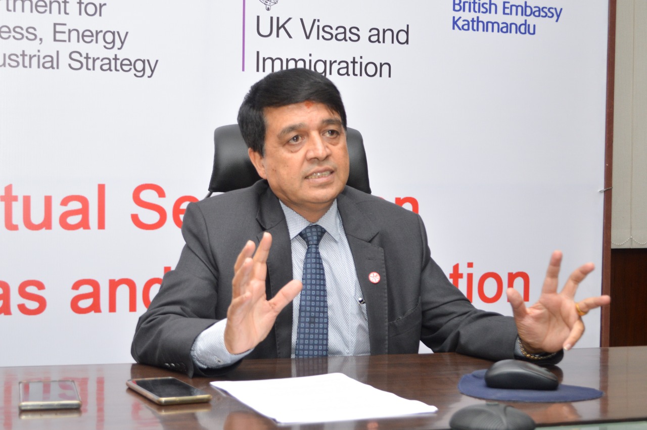 महासंघले आज काठमाडौंस्थित बेलायती दूतावासको अन्तर्राष्ट्रिय व्यापार विभाग र भिसा तथा आप्रवासन विभागसँगको सहकार्यमा आयोजना गरेको ‘बेलायत भिसा र अध्यागमन’ विषयक भर्चुअल अन्तरक्रियामा उहाँले काठमाडौंस्थित बेलायती दूतावासबाटै निजी क्षेत्रका लागि यूके भिसा उपलब्ध गराउनुपर्ने आवश्यकतामा जोड दिए।