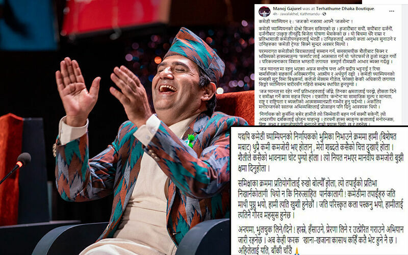 यसैबीच ‘कमेडी च्याम्पियन’को निर्णायक मण्डलमा बसेका चर्चित हाँस्यव्यङ्ग्य विधाका मुर्धन्य कलाकार मनोज गजुरेलले सामाजिक सञ्जाल फेसबुकमा एक पोष्ट गर्दै कमेडी ‘च्याम्पियन सिजन – २’ को सम्पूर्ण अवधिभर आफूले कुनै गल्ती गरेको भए क्षमा गरिदिन भन्दै आफ्ना अनुभव र बाध्यता शेयर गरेका छन् ।