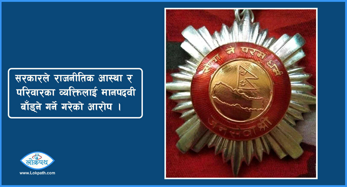 ओलीले आइतबार सरकारले बाँडेको मानपदवीबारे टिप्पणी गर्दै भने, ‘कस्ता–कस्ताको घाँटीमा पुगिने भैयो भनेर पदकहरूले लाज मानिरहेका छन् ।’ सरकारले राजनीतिक आस्था र परिवारका व्यक्तिलाई मानपदवी प्रदान गरेको ओलीले दाबी गरे ।