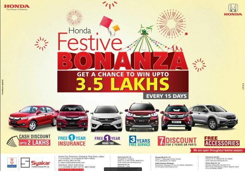 चाडपर्व उत्सवमा नयाँ होण्डा कार खरिद गर्ने ग्राहकहरुले हात खाली नजाने गरी २ लाखसम्मको नगद छुट, १ वर्षसम्मको लागि फ्रि इन्स्योरेन्स, १ वर्षसम्मको लागि फ्रि रोड ट्याक्स, ३ वर्षसम्मको लागि फ्रि सर्भिसिङ्ग, ३ वर्षसम्मको लागि स्पेयर पार्टस्मा ७%को छुटका साथै अन्य धेरै फ्रि आकर्षक उपहार प्राप्त गर्न सक्नेछन् ।
