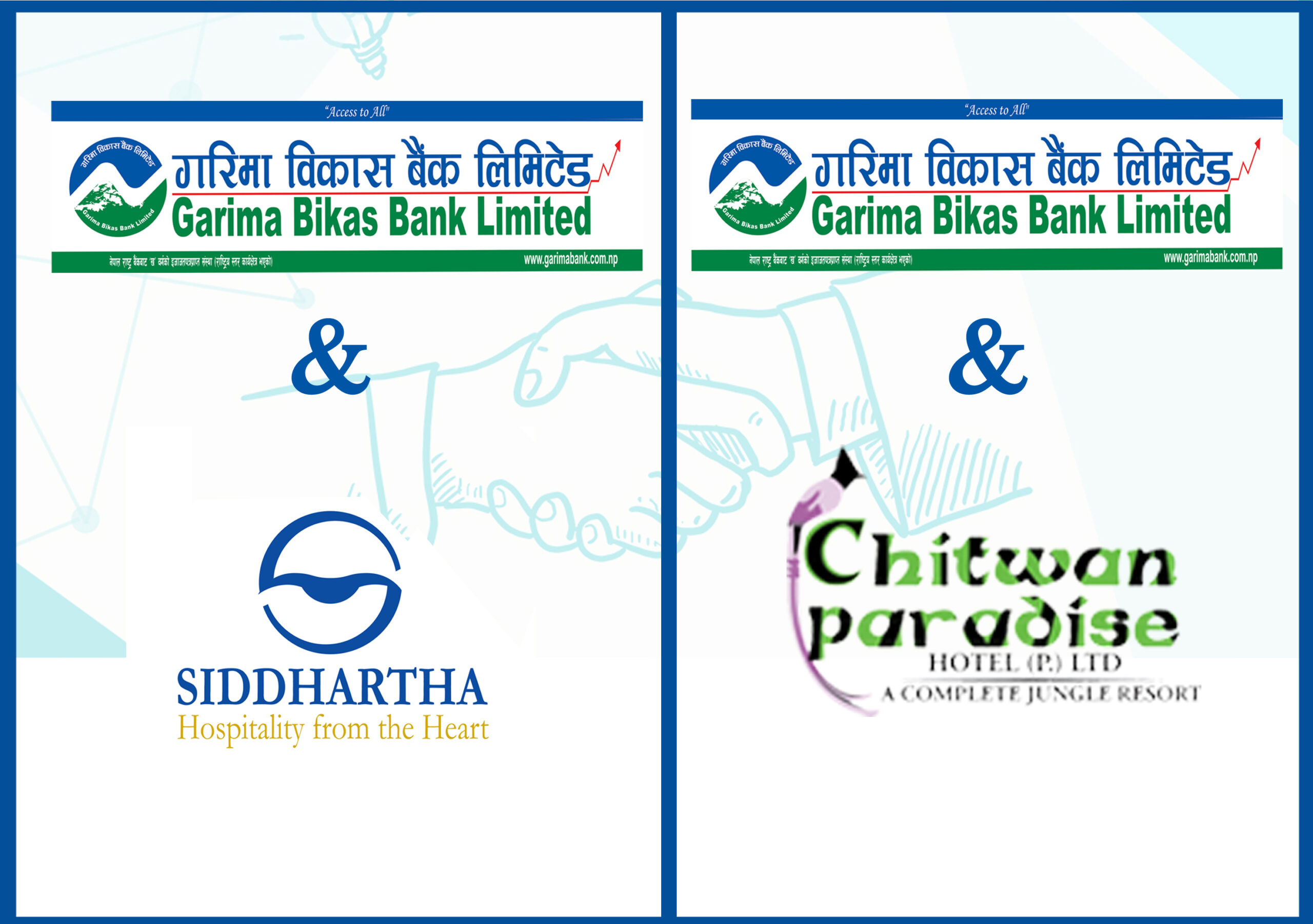 बैंकद्वारा जारी विज्ञप्तिअनुसार गरिमा विकास बैंकका डेविट कार्ड तथा मोबाइल बैंकिङ प्रयोगकर्ताहरुले ‘सिद्धार्थ बिजनेस ग्रुप अफ हस्पिटालिटी’ र ‘चितवन प्याराडाइज होटल’को शाखाहरुबाट विल भुक्तानी गर्दा रुम र फुड एण्ड वेभरेजमा आकर्षक छुट पाउनेछन्।
