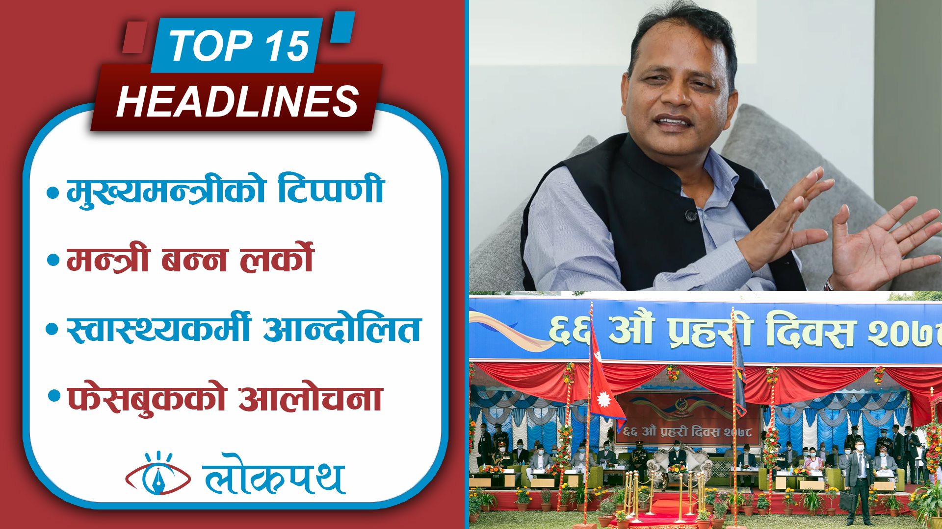 ३. प्रदेश २ का मुख्यमन्त्री लालबाबु राउतले पाए विश्वासको मत, अख्तियारले प्रदेश २ सरकारलाई बद्नाम गराउन खोजेको राउतको टिप्पणी, बेटी पढाउ, बेटी बचाउ अभियान’ कार्यक्रमलाई विवादित बनाउने षड्यन्त्र भएको आरोप ।