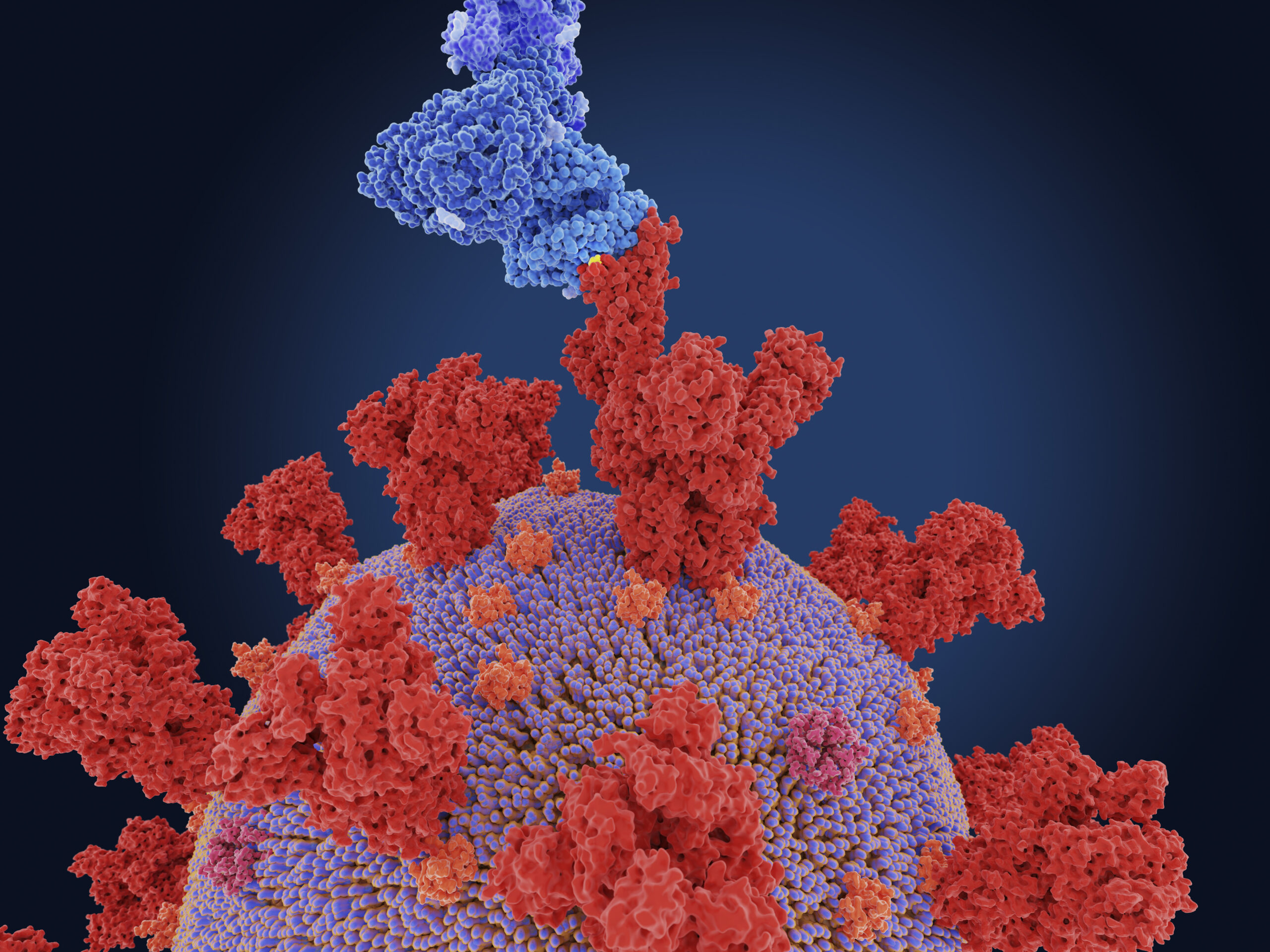In the main mutation site (yellow) of the South African coronavirus variant B.1.531, a glutamic acid amino acid is replace by a lysine one at the position 484. A spike protein (red) is bound to an angiotensin converting enzyme 2 (blue), which is embedded in a human cell membrane.
