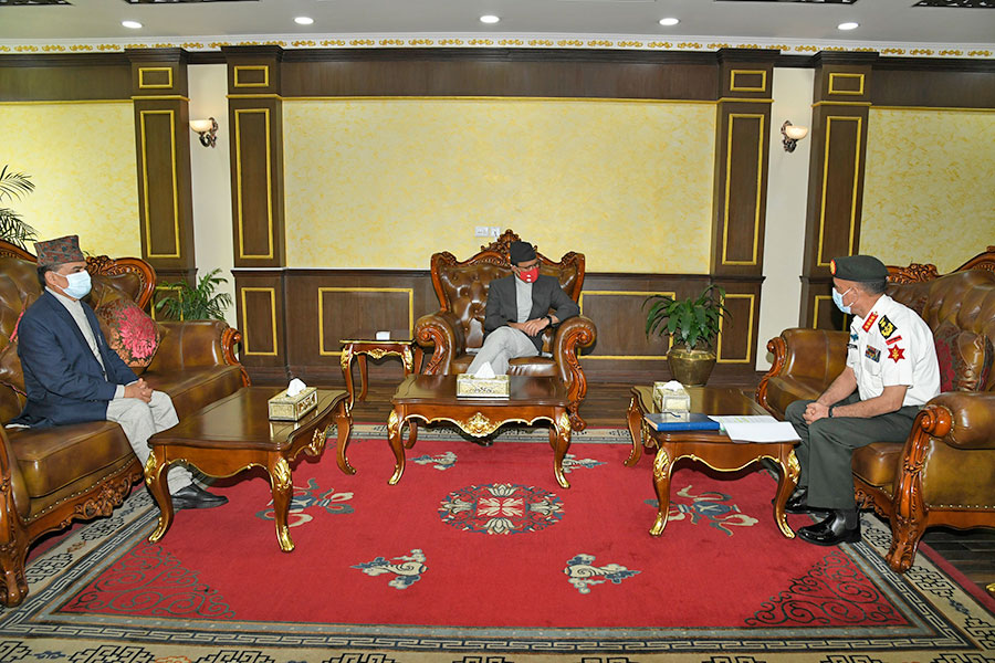 भेटघाटको क्रममा प्रधानसेनापति प्रभुराम शर्माले नेपाली सेना जस्तोसुकै परिस्थितिमा पनि संविधानप्रदत्त जिम्मेवारी निर्वाह गर्न कटिबद्ध रहेको बताएको जंगी अड्डाले जनाएको छ ।
