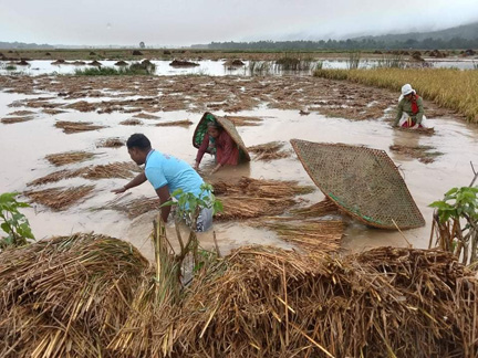 दसैँ टीका लगाएर किसान धान काट्न सुरु गरेका थिए । “दुई दिनसम्म धान काट्यौँ, अहिले लगातारको पानीले पाकेको धान सखाप पारेको छ, अब कसरी धानलाई भित्र्याउने भन्ने चिन्ता छ”, दङ्गीशरण गाउँपालिका–३ का ३५ वर्षीय किसान खुशीराम चौधरीले भने । उनले थपे, “यसपटक समयमा नै पानी परेपछि धान रोपाइँ पनि समयमा गरौँ, मलको अभाव पनि थिएन । धान पनि राम्रो थियो तर अहिले घरमा भित्र्याउन लाग्दा पानी परेर ठूलो क्षति भयो ।”