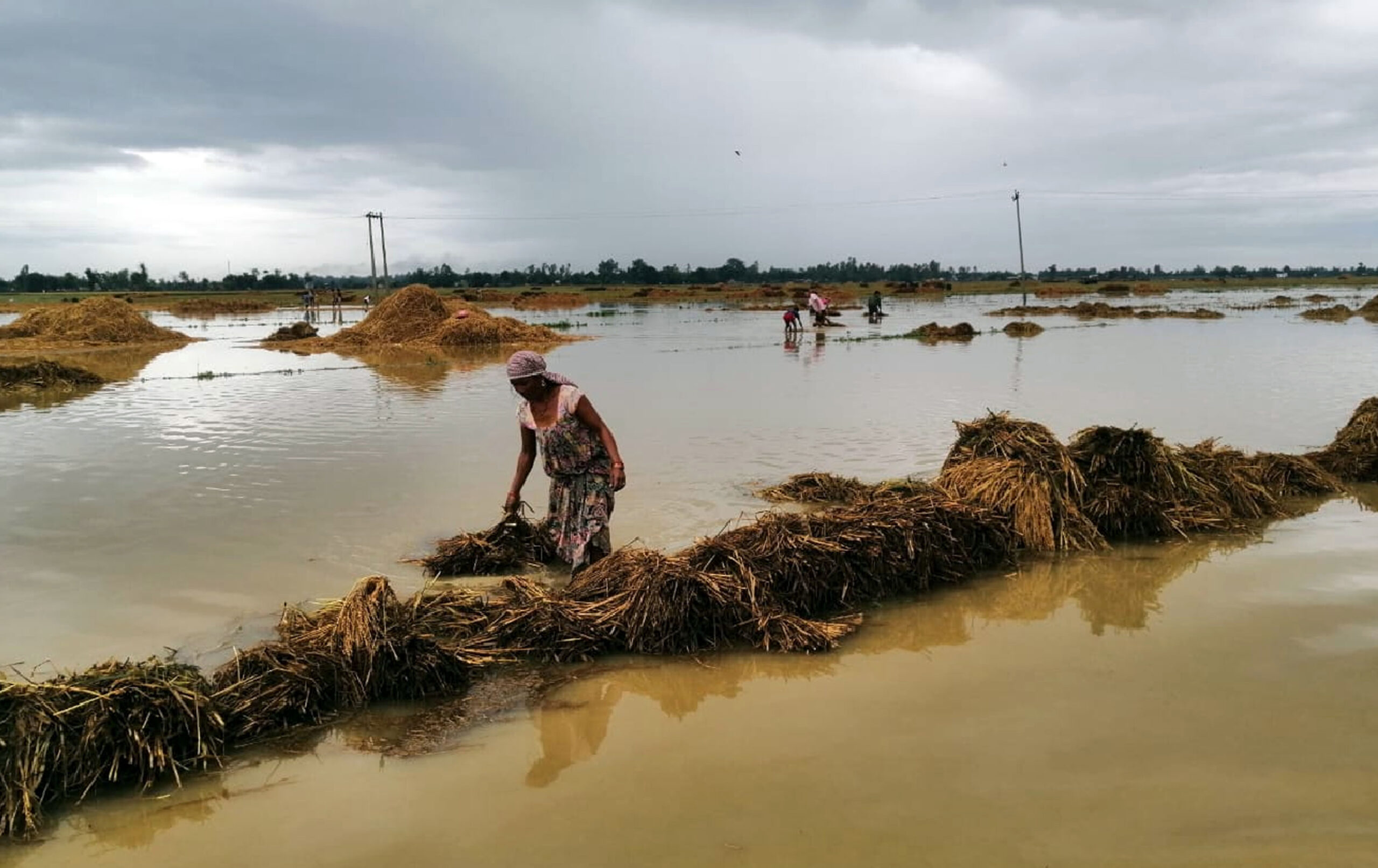 आइतबार रातिदेखि भएको अविरल वर्षाका कारण कञ्चनपुरको शुक्लाफाँटा काला गौडीमा डुबानमा परेको नीनमा सुकाएको धान निकाल्दै किसान ।