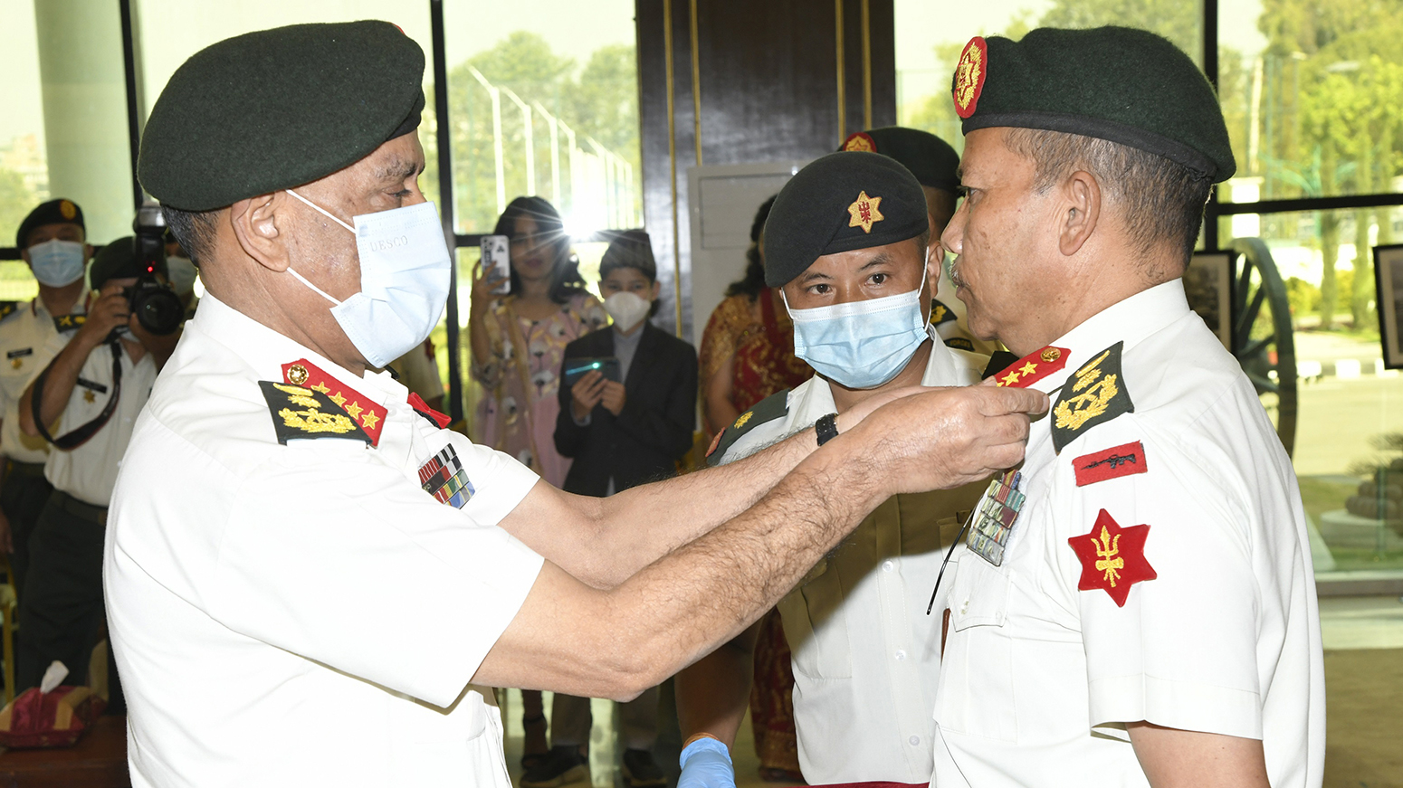 काठमाडौं । प्रधानसेनापति प्रभुराम शर्माले रथीमा पदोन्नति हुनुभएका सरोजप्रताप राणालाई दर्ज्यानी चिह्न प्रदान गरेका छन् । सैनिक मुख्यालय जङ्गी अड्डामा आज आयोजित समारोहमा महारथी शर्माले रथी राणालाई दर्ज्यानी चिह्न लगाई दिएका छन्।