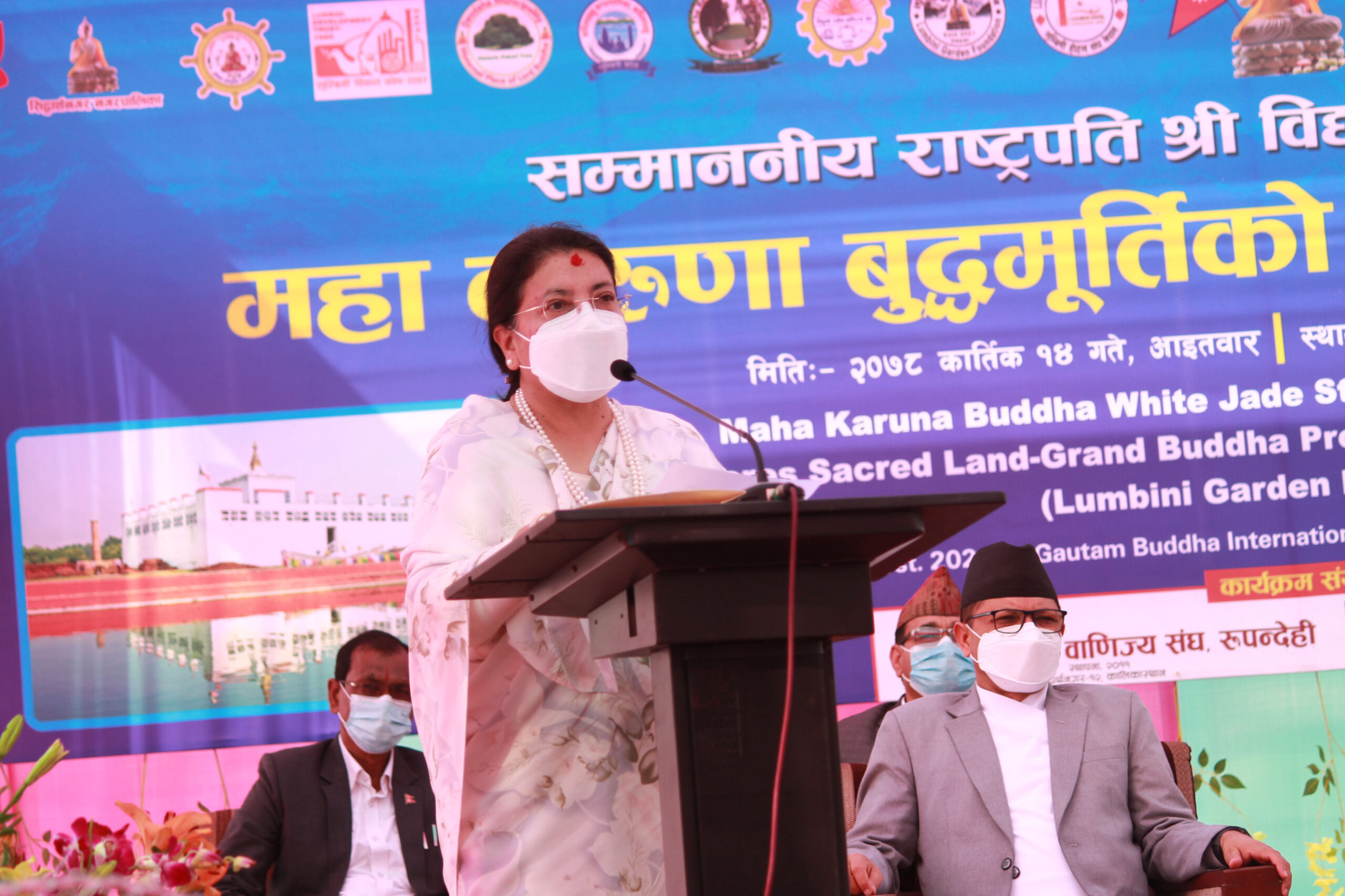 आइतबार रुपन्देहीमा गौतमबुद्ध अन्तर्राष्ट्रिय विमानस्थलमा राखिएको महाकरुणा बुद्धमुर्तिको अनावरण गर्दै राष्ट्रपति भण्डारीले मानव जातिले बुद्ध दर्शनलाई दैनिक जीवनमा आत्मसात् गरेर अगाडि बढे मात्रै विश्वमा दिगो शान्ति कायम हुन सक्ने बताएकी हुन् ।