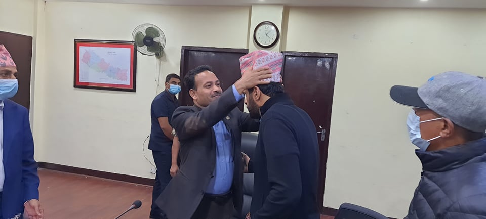 शनिबार नेपाल फर्किए लगतै आईतबार सिंहदरबारस्थित मन्त्रालय पुगेका अलमुताइरीलाई मन्त्री गहतराजले दोसल्ला र ढाका टोपी लगाएर स्वागत तथा सम्मान गरे ।