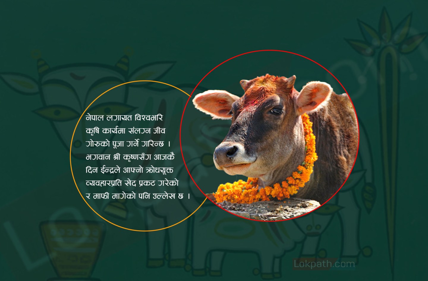 नेपाललगायत विश्वभरि कृषि कार्यमा संलग्न जीव गोरुको पूजा गर्ने गरिन्छ । भगवान् श्री कृष्णसँग आजकै दिन ईन्द्रले आफ्नो क्रोधयुक्त व्यवहारप्रति खेद प्रकट गरेको र माफी मागेको पनि उल्लेख छ ।