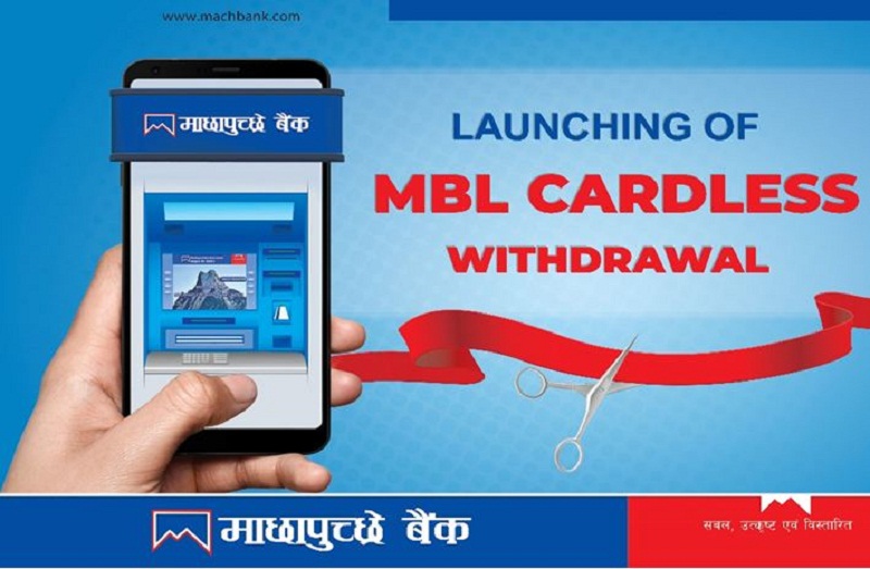 काठमाडौं । माछापुच्छ्रे बैंक लिमिटेडले ‘एमबीएल कार्डलेस विथड्रल’ (MBL CARDLESS WITHDRAWAL)सेवा संचालनमा ल्याएको छ ।