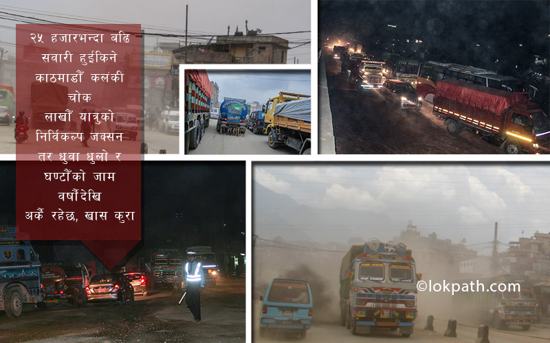 यी भन्दा धेरै दृश्य पेश गर्नु पर्दैन । कलंकी चोकको व्याख्या गर्न । कल्पना गरिएका झै लाग्ने यी दृश्यहरु देशको प्रमुख नाका कलंकी चोक हिडेका, हिड्ने वा हिड्नुहुने जो कोहिले पनि अनुभव गर्ने कुरा हो । लाखौँ यात्रुहरु काठमाडौँ भित्रिने र बाहिरीने मुख्य चोकको यो भद्रगोल अवस्थाले दैनिक रुपमा लाखौँ यात्रु र स्थानिय तथा कंलकी क्षेत्रबासी कष्टकर जीवनयापन गर्नुपरेको छ । भन्नलाई त भनिएको छ, “३० महिनामा बनाइसक्ने लक्ष्यका साथ २०७१ साल साउनबाट निर्माण थालिएको ९ किलोमिटर लामो कंलकी – नागढुंगा सडक अलपत्र अबरुद्ध हुनु, चीन सरकारको सहयोगमा सन् २०१८ मार्चसम्म पुरा गर्ने लक्ष्यसहित कलंकी चोकस्थित निर्माणाधीन ‘अन्डरपास वे’को निर्माण कार्य समयमा नै सम्पन्न हुन नसक्नु जस्ता कारणहरुले गर्दा लाखौँ यात्रुहरु र कंलकी क्षेत्रबासी र ले हरेक पल निकै कष्टकर यात्रा गर्नुपरेको छ ।”