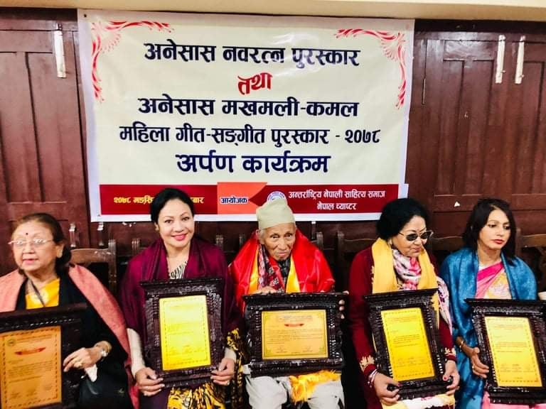 काठमाडौं । अन्तर्राष्ट्रिय नेपाली साहित्य समाज नेपाल च्याप्टरको आयोजनामा ‘मखमली कमल महिला गीत सङ्गित पुरस्कार २०७८’ र ‘नवरत्न पुरस्कार २०७८’ समर्पण कार्यक्रम सम्पन्न भएको छ ।