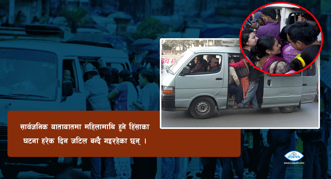 काठमाडौं । महिलामाथि हुनेगरेका कयौँ हिंसामध्ये सार्वजनिक यातायातमा गरिने यौनजन्य हिंसा पनि एक जटिल हिंसा हो । सार्वजनिक यातायातजस्तो बारम्बार प्रयोग गर्नुपर्ने ठाउँमा समेत महिलाहरू निर्धक्कसँग यात्रा गर्न पाउँदैनन् । हेर्दा सामान्य लागे पनि यो समस्या हरेक दिन निकै जटिल बन्दै गइरहेको छ ।