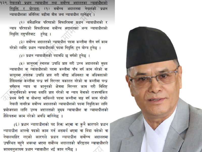 ‘प्रधानन्यायाधीशको पद रिक्त भएमा वा कुनै कारणले प्रधानन्यायाधीश आफ्नो पदको काम गर्न असमर्थ भएमा वा बिदा बसेको वा नेपालबाहिर गएको कारणले प्रधानन्यायाधीश सर्वोच्च अदालतमा उपस्थित नहुने अवस्था भएमा सर्वोच्च अदालतको वरिष्ठतम न्यायाधीशले कायममुकायम प्रधानन्यायाधीश भई काम गर्नेछन्’, नेपालको संविधानको धारा १२९ को उपधारा ६ मा भनिएको छ ।